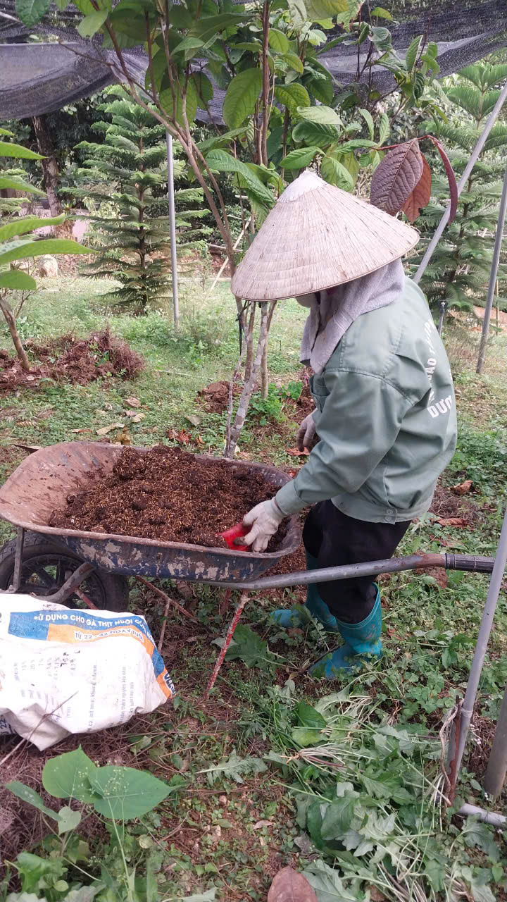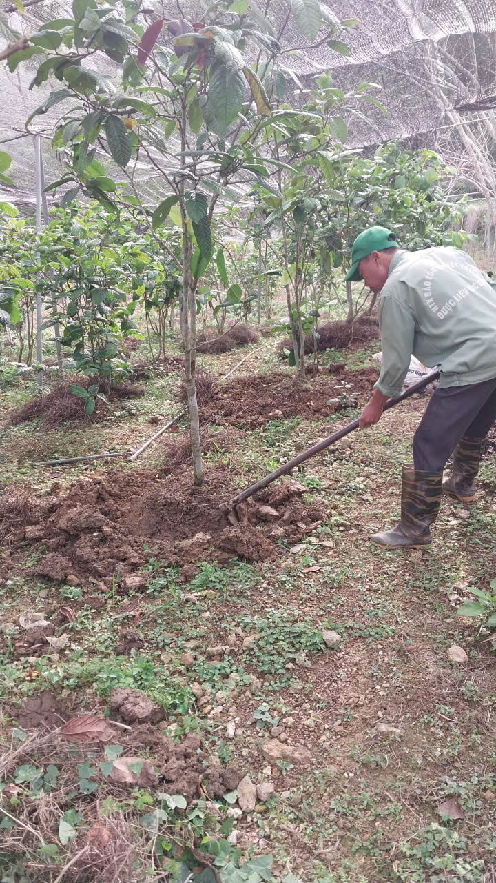 10-02-2026 12:02:00 Bón Thúc Tiến hành bón phân cho cây Trà Hoa Vàng. Loại phân được sử dụng là phân chuồng ủ hoai mục. Lượng dùng: Mỗi gốc 1,5 - 2 kg phân, tùy độ lớn của cây. Cách bón: Đào rãnh hình vành quanh gốc cây theo đường kính tán lá (cách gốc 20cm). Bón phân xong lấp đất lại. Tổng khối lượng: 2 tấn Hoàn thành