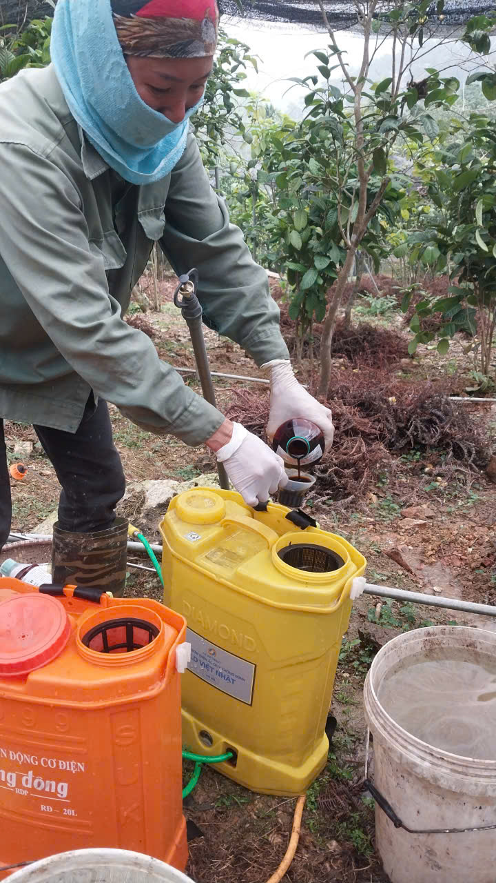 20-11-2025 12:11:00 Bảo vệ thực vật Tiến hành phun chế phẩm sinh học trừ sâu thảo mộc kết hợp Anisaf 01, 02 và 03 cho cây trà. Cách dùng: pha tỉ lệ 230ml mỗi loại chế phẩm 01, 02 vào chung một bình phun 20l, do mùa hanh khô, cần phun tăng lượng thuốc 01 và 02 để phòng trị. Tiến hành pha và phun cho toàn bộ khu vực. Tổng 13 bình phun. . Hoàn thành